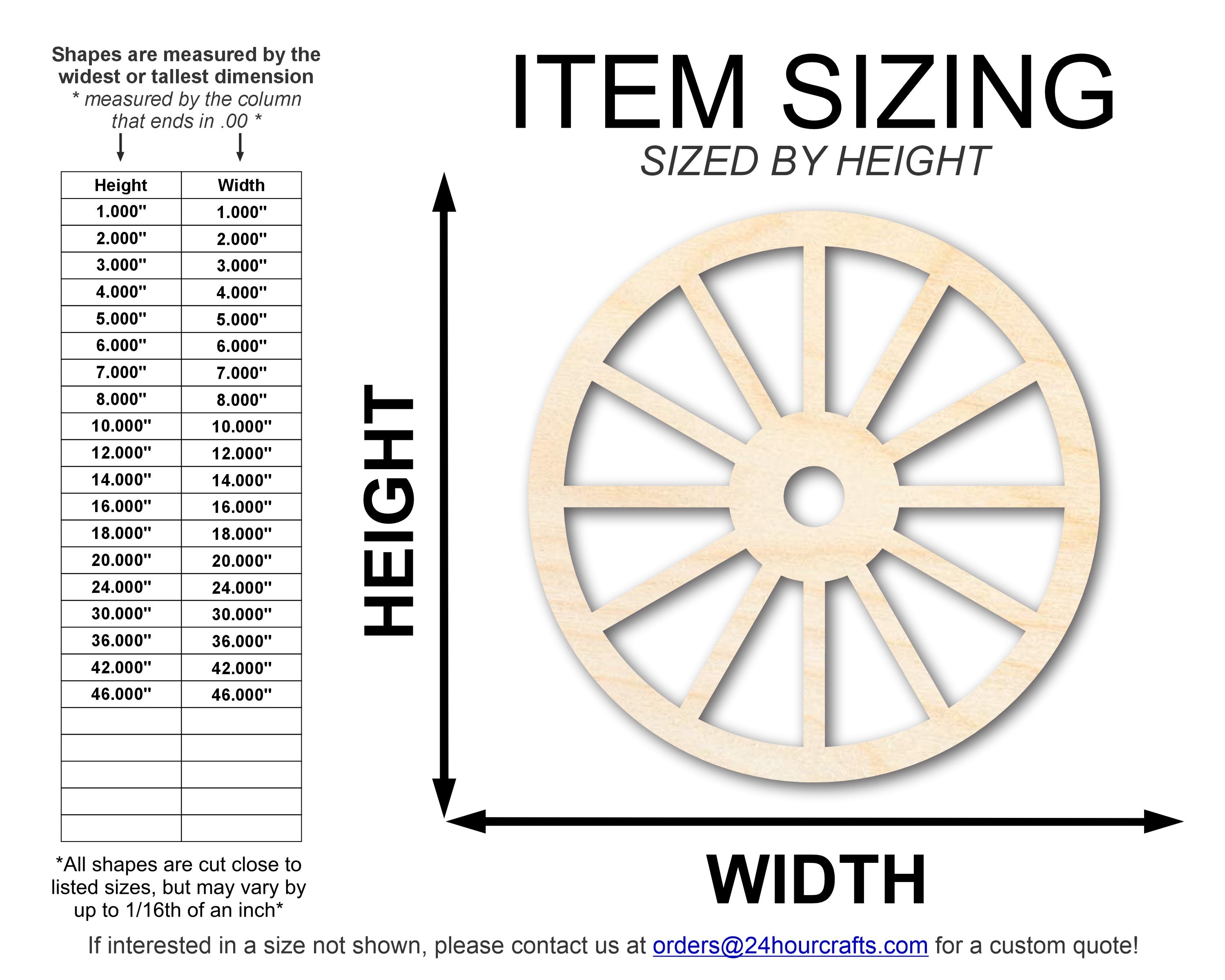 Crafted with precision and attention to detail, our wagon wheel shape captures the charm of a bygone era, adding a touch of nostalgia to any space. From small, intricate designs to larger statement pieces, this cutout comes in sizes ranging from 3 to 24 inches, allowing you to choose the perfect dimensions for your project.