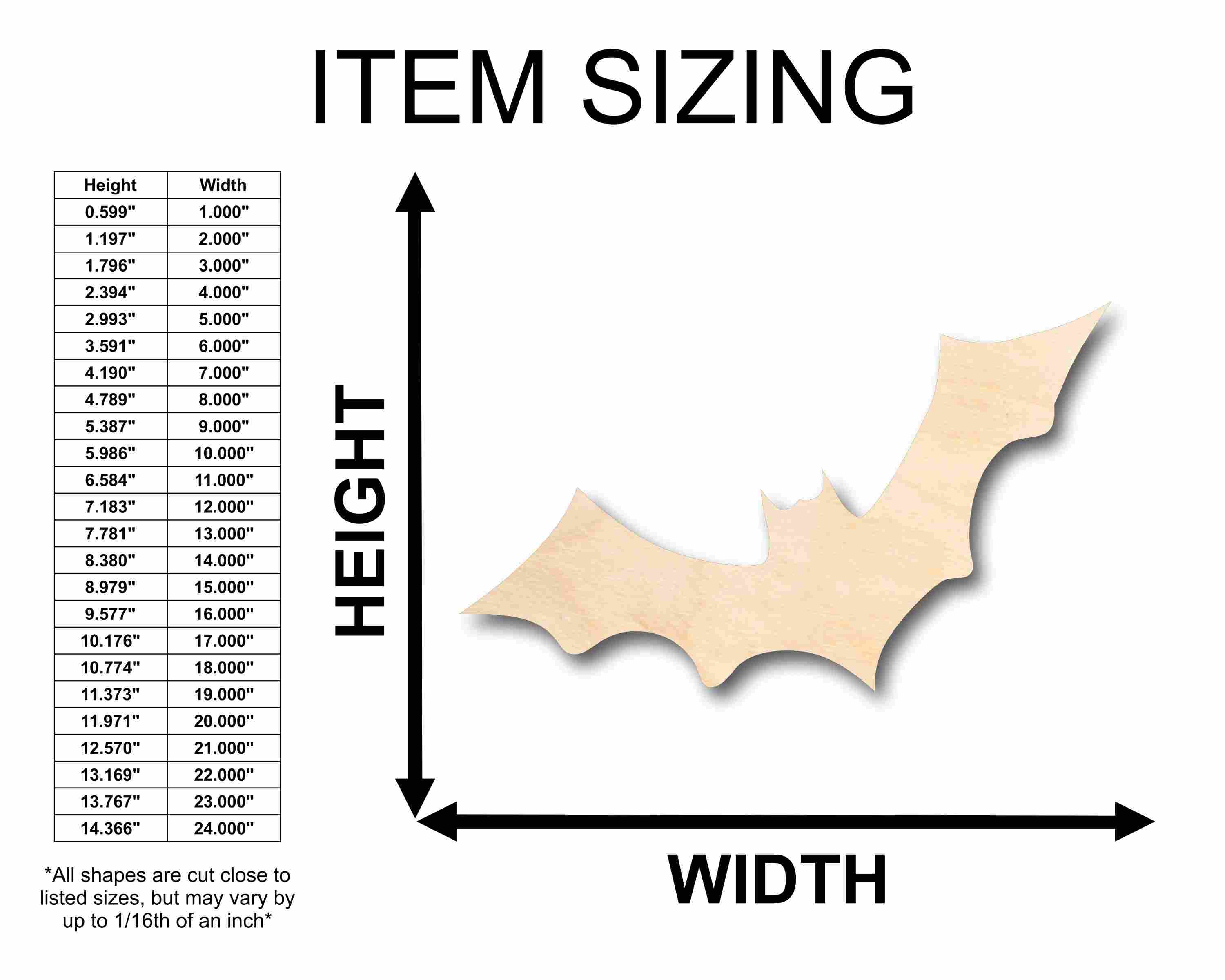 Unfinished wood shapes are available from 3" up to 48" (Some intricate shapes will not be available at smaller sizes)