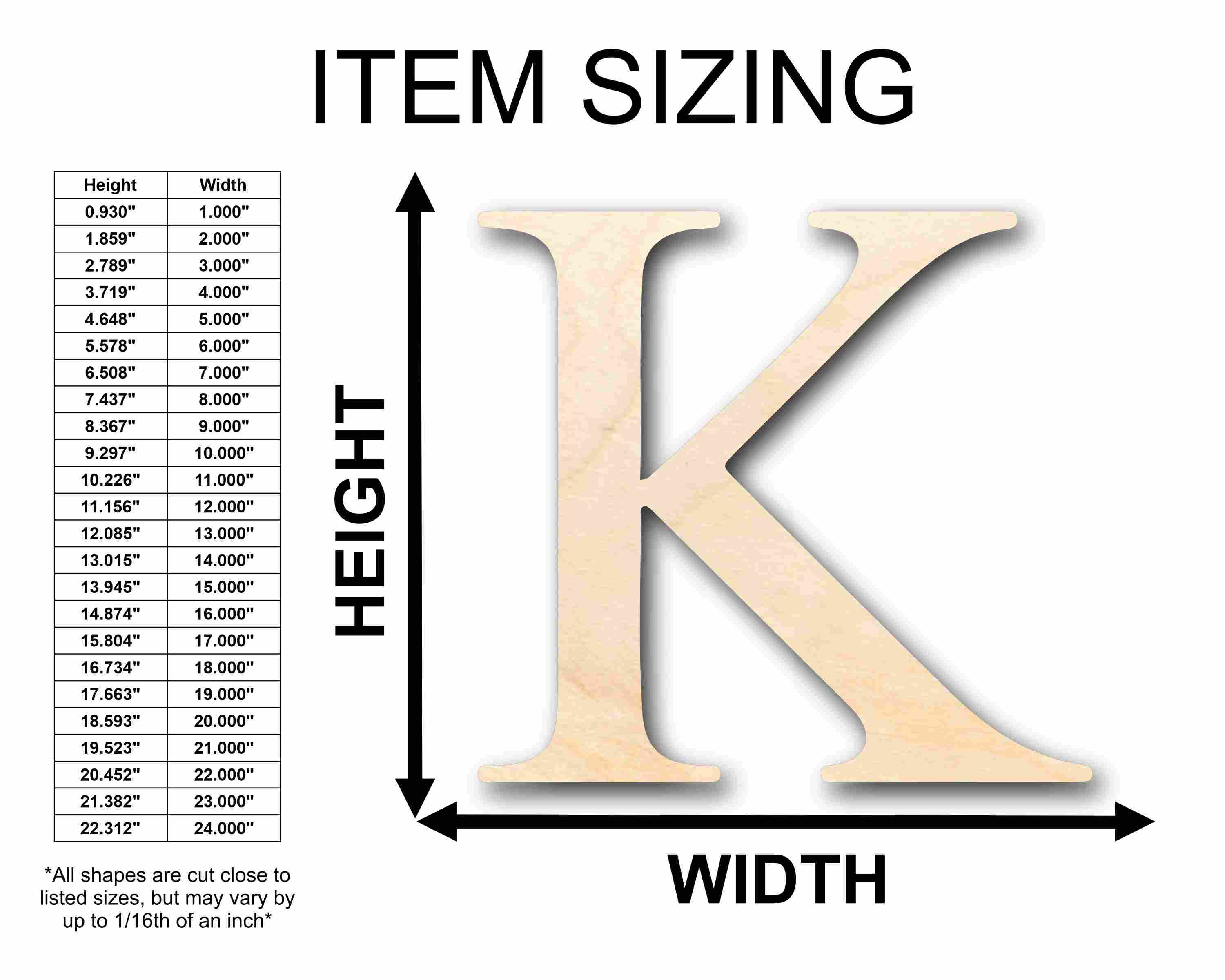 Unfinished wood shapes are available from 3" up to 48" (Some intricate shapes will not be available at smaller sizes)