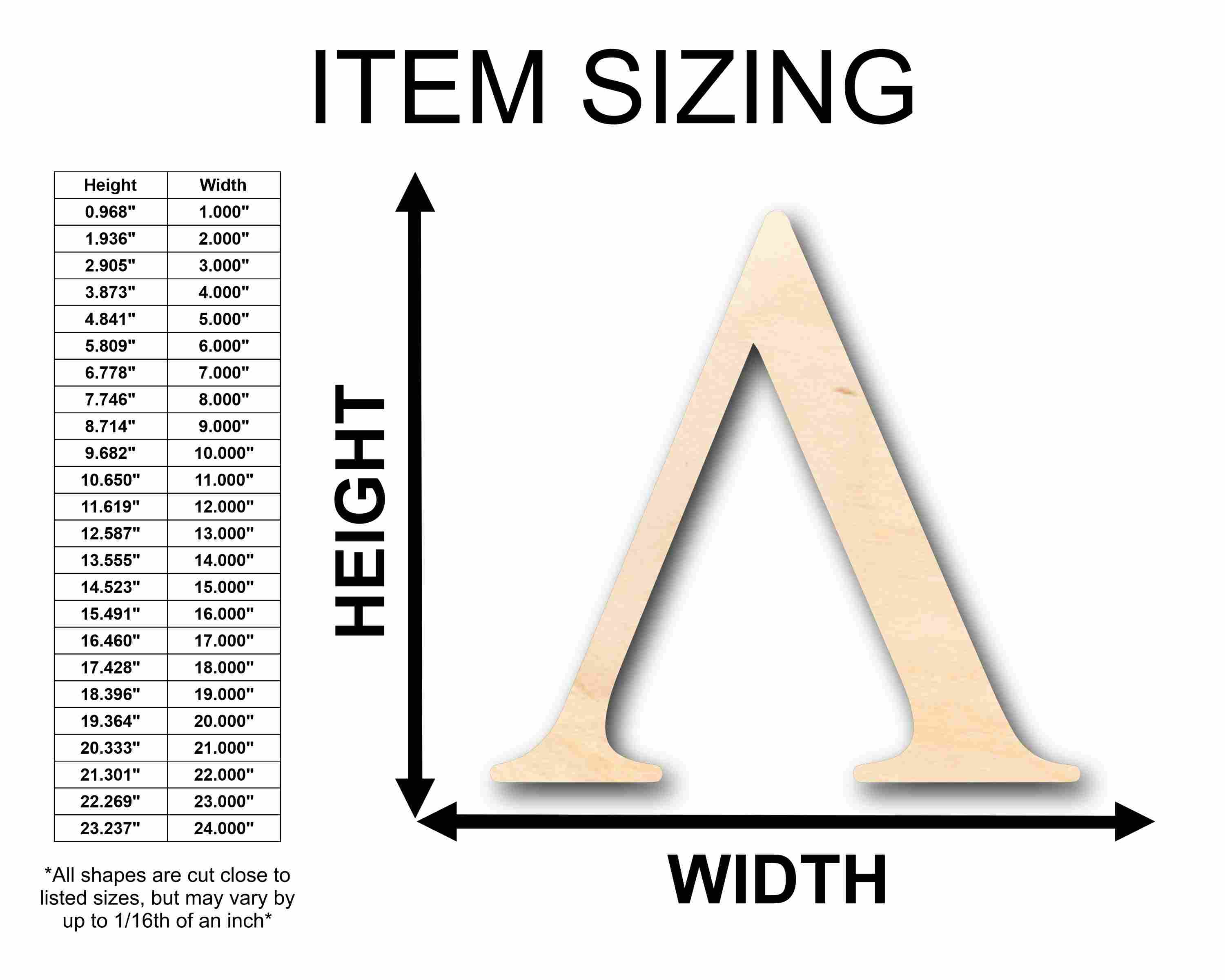 Unfinished wood shapes are available from 3" up to 48" (Some intricate shapes will not be available at smaller sizes)