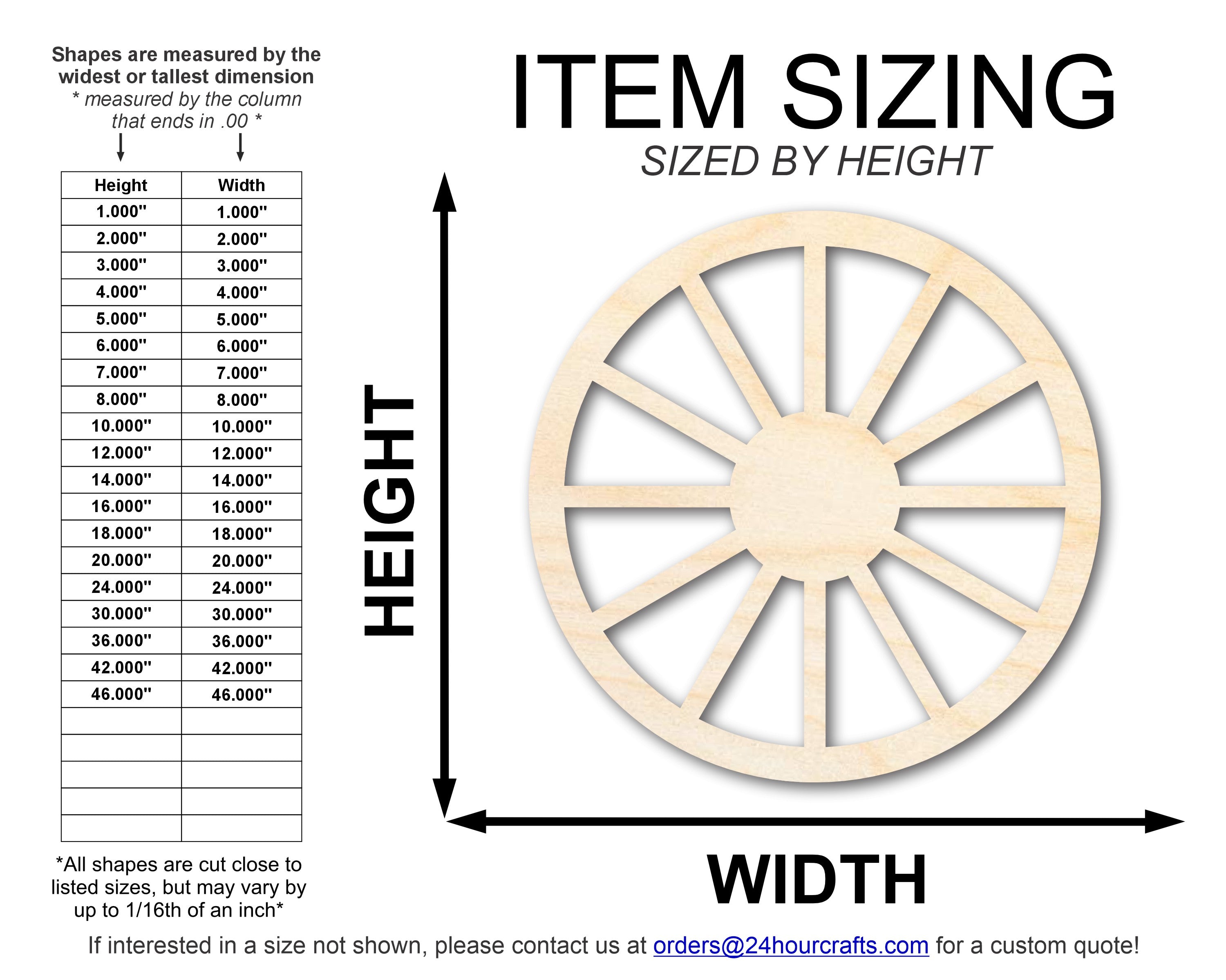 Crafted with precision and attention to detail, our wagon wheel shape captures the charm of a bygone era, adding a touch of nostalgia to any space. From small, intricate designs to larger statement pieces, this cutout comes in sizes ranging from 3 to 24 inches, allowing you to choose the perfect dimensions for your project.